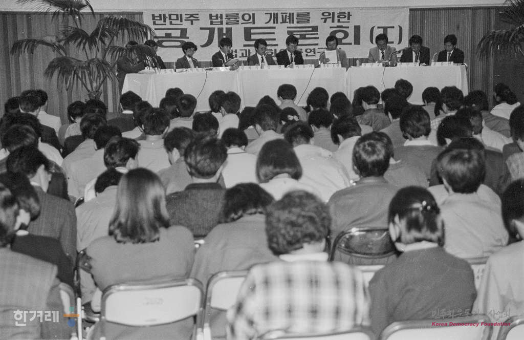 - 1989년 3월 31일 법과사회 이론연구회 소속 연구원들이 반민주 법률의 개폐를 위한 공개토론회를 하고 있다.