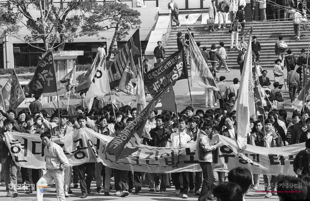 - 1989년 3월 31일 서총련은 현대중공업 파업지지 결사대를 울산에 보내기로 한 가운데 연세대 민주광장에서 대학생들이 현대중공업 강제진압 규탄 결의대회를 갖고 있다.