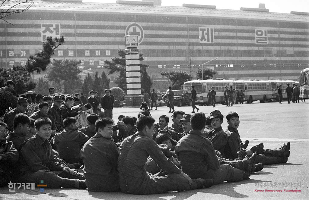 - 1989년 3월 31일 현대중공업 파업농성이 30일 경찰에 강제진압된 뒤 진압경찰들이 회사내 운동장에서 머물며 휴식을 취하고 있다.