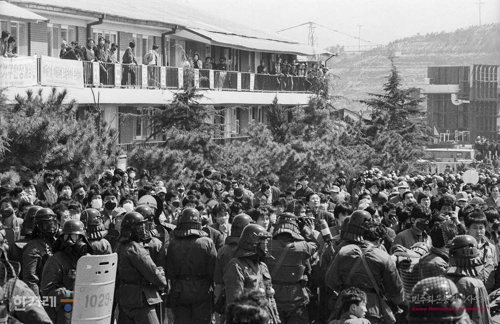 - 1989년 3월 31일 현대중공업 파업농성이 30일 경찰에 강제진안된 뒤 현대중공업 노동자를 비롯한 울산시내 현대계열사 노동자들이 동조시위가 잇따르는 가운데 대구지역대학생협의회 소속 대학생 50여명이 작업모와 작업복을 착용하고 울산시 전화동 만세대 숙소 앞 민주광장에서 현대계열사 노동자 3천여명과 함게 경찰의 강제진합을 규탄하고 있다.