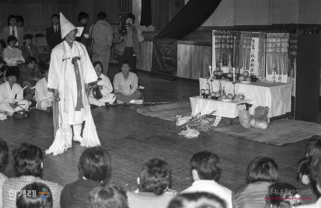 - 1989년 4월 1일 사건발생 41년만에 4.3제주항쟁 희상자들에 대한 추모제가 처음으로 제주시민회관에서 열려 정공철 제주문화운동협의회 회장에 제사에 여러 신들을 부르는 초감제를 올리고 있다. 추모제 첫날 초감제를 비롯해 제주 4.3 연구소의 4.3관련 슬라이드 상영, 우리노래연구회의 노래 공연과 놀이패 한라산의 마당굿 <한라산>공연도 이어졌다.