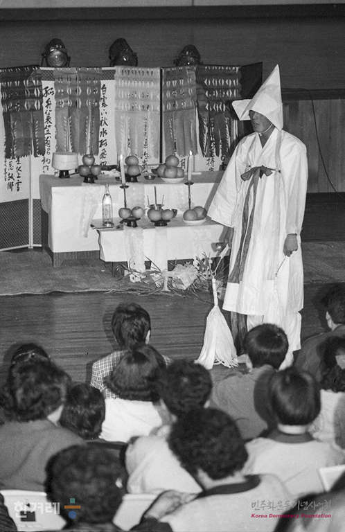 - 1989년 4월 1일 사건발생 41년만에 4.3제주항쟁 희상자들에 대한 추모제가 처음으로 제주시민회관에서 열려 정공철 제주문화운동협의회 회장에 제사에 여러 신들을 부르는 초감제를 올리고 있다. 추모제 첫날 초감제를 비롯해 제주 4.3 연구소의 4.3관련 슬라이드 상영, 우리노래연구회의 노래 공연과 놀이패 한라산의 마당굿 <한라산>공연도 이어졌다.