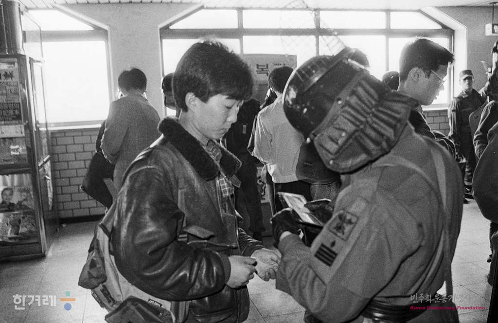 - 1989년 4월 1일 서총련주최로 현대중공업 폭력탄압규탄 및 민중운동탄압 주범 노태우 퇴진 실천대회 집회가 예정된 한양대인근 전철역입구에서 경찰들이 한양대로 향하는 대학생들을 일일이 검문검색을 하고 있다.