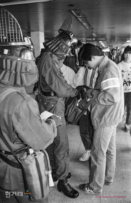 - 1989년 4월 1일 서총련주최로 현대중공업 폭력탄압규탄 및 민중운동탄압 주범 노태우 퇴진 실천대회 집회가 예정된 한양대인근 전철역입구에서 경찰들이 한양대로 향하는 대학생들을 일일이 검문검색을 하고 있다.