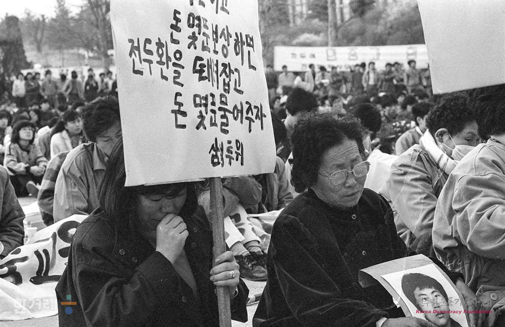 - 1989년 3월 26일 시민과 학생, 재야단체회원들이 서울 고려대 민주광장에서 노태우정권 퇴진을 위한 공동투쟁본부에서 개최한 ‘중간평가 왜 연기되었나? 주제로 시국대토론회를 하고 있는 가운데 삼청교육대 피해자 가족들이 진상규명을 요구하는 손팻말을 들고 있다.