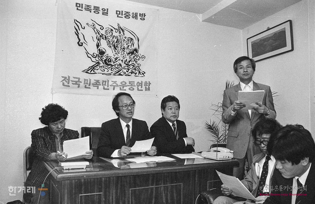 - 1989년 4월 3일 정부가 재야단체에 대한 일제 수사에 들어가 고은, 이재오씨등 2명을 구속하자 전민련 집행부는 사무실에서 구속자 석방과 탄압중지를 요구하며 기자회견을 갖고 있다.