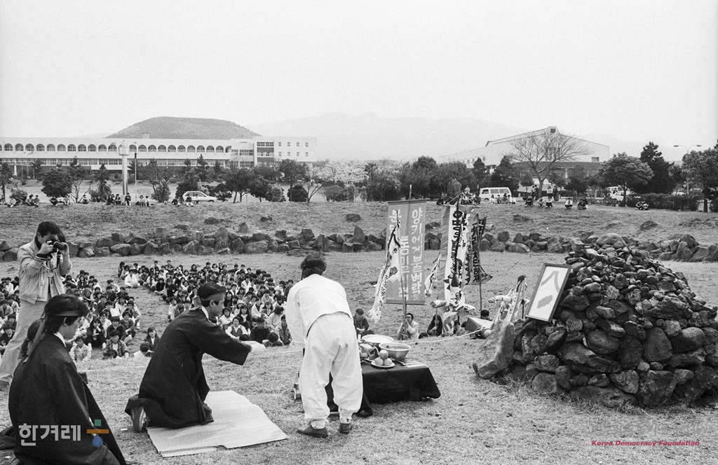 - 1989년 4월 3일 사건발생 41년만에 제주문화운동협의회 제주사회문제협의회등 11개 단체로 구성된 41주기 4.3추모제 준비위원회가 주최하는 4.3자주항쟁계승 및 구구선열추모제가 제주대를 비롯해 제주대학 총학생회협의회소속 대학생 1천여명이 참석한 가운데 제주대학교에서 열려 추모제에 앞서 희생자를 위로하는 제사를 지내고 있다.