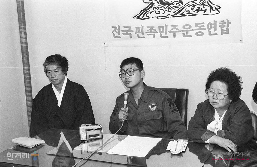 - 1989년 4월 3일 오전11시 울산 현대중공업 강제진합작전에 참여했던 경기도 경찰국 기동2중대 3소대 소속 유진태일경이 서울 종로구 전민련 사무실에서 전경의 재벌과 정권의 사병화시키지 말고 해체를 요구하며 양심선언을 하고 있다.