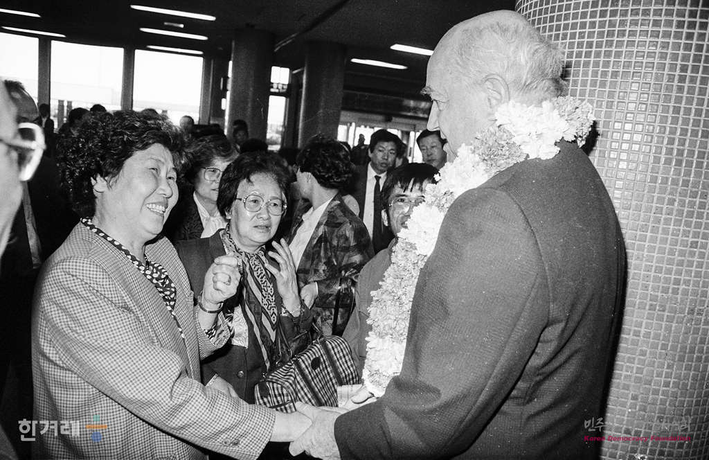 - 1989년 4월 5일 인혁당사건과 관련해 지난 75년 4월 한국정부로부터 강제출국 당했던 제임스 시노트(미국 메리놀선교회소속)신부가 14년만에 서울 김포공황으로 입국한 뒤 마중나온 윤활식 동아투위 위원장을 비롯한 인혁당 관련 가족들로부터 환영인사를 받고 있다.