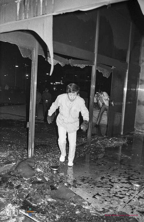- 1989년 4월 5일 밤 11시 30분 서총련 북부지구 소속 대학생 40여명이 서울 종로구 계동 현대그룹 본사 현관으로 몰려와 현대중공업 노동자 탄압하는 노정권 퇴진 및 정주영 정몽준 구속 등을 외치며 화염병 40여개을 던쳐 건물 앞 대형유리창 13장이 깨지고 카핏 일부가 불타자 직원들이 나와 청소하고 있다.
