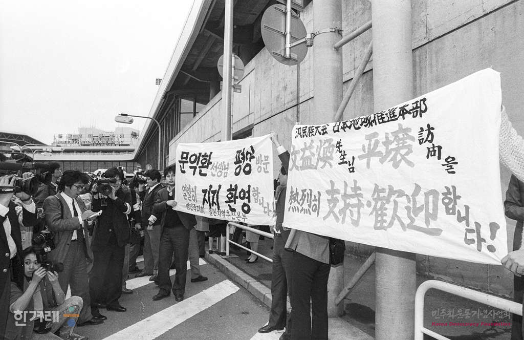 - 1989년 4월 5일 북한방문을 마친 문익환 목사가 중국 민항 소속 925편으로 일본 도쿄 나리타공원에 도착해 마중나온 인사들과 기자들의 질문을 뒤로하고 내외신기자회견이 예정되어 있는 일본기독교회관으로 가고 있다.