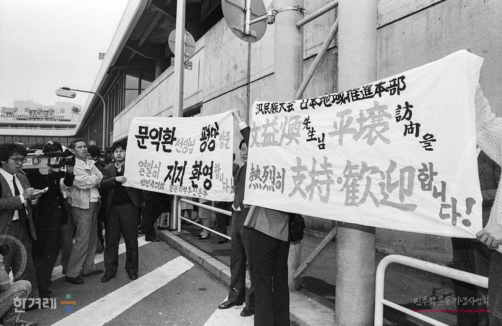 - 1989년 4월 5일 북한방문을 마친 문익환 목사가 중국 민항 소속 925편으로 일본 도쿄 나리타공원에 도착해 마중나온 인사들과 기자들의 질문을 뒤로하고 내외신기자회견이 예정되어 있는 일본기독교회관으로 가고 있다.