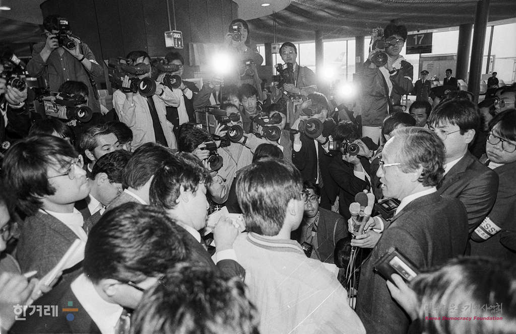 - 1989년 4월 5일 북한방문을 마친 문익환 목사가 중국 민항 소속 925편으로 일본 도쿄 나리타공원에 도착해 마중나온 인사들과 기자들의 질문을 뒤로하고 내외신기자회견이 예정되어 있는 일본기독교회관으로 가고 있다.