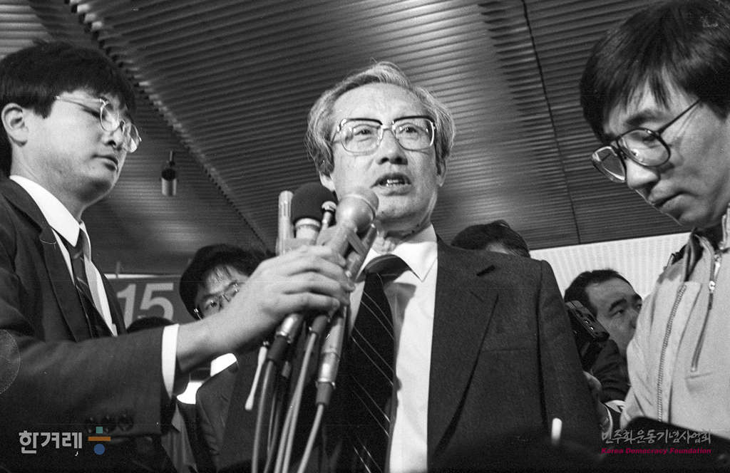- 1989년 4월 5일 북한방문을 마친 문익환 목사가 중국 민항 소속 925편으로 일본 도쿄 나리타공원에 도착해 마중나온 인사들과 기자들의 질문을 뒤로하고 내외신기자회견이 예정되어 있는 일본기독교회관으로 가고 있다.