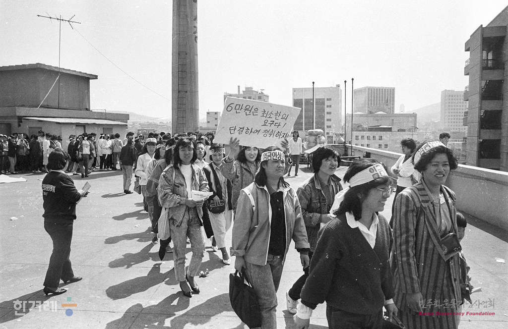 - 1989년 4월 6일 서울지역노동조합협의회 등 6개 노조협의회연맹 의장단 30여명은 서울 창신1동 청계피복노동조합 사무실에서 서울지하철 현대중공업 노조에 대한 공권력개입을 규탄하며 3일간 밤샘농성이 들어가며 성명서를 낭독하고 있다.
