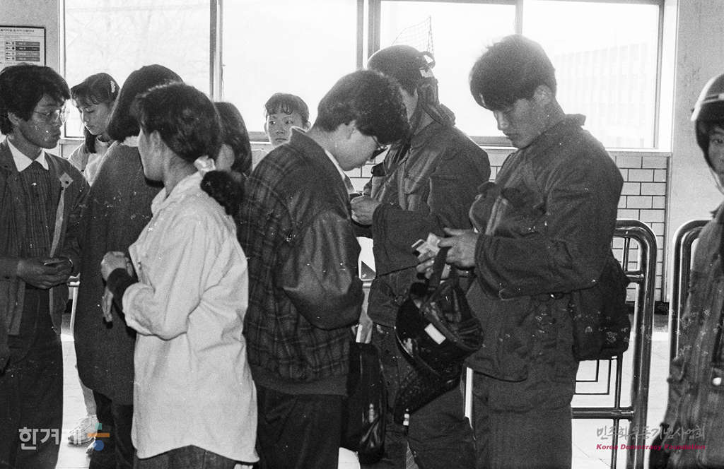 - 1989년 4월 8일 오후 3시 민중운동탄압 분쇄 및 노동자 학생연대를 위한 학생투쟁연합주비위 소속 서울시내 17개대학생 4백여명이 한양대 민주광장에 모여 학생투쟁연합 준비위원회 발족식 및 노학선봉대 출정식이 예정되어 있는 가운데 한양대역 전철역입구에서 경찰이 불심검문을 붙잡은 대학생들을 강제연행하고 있다.