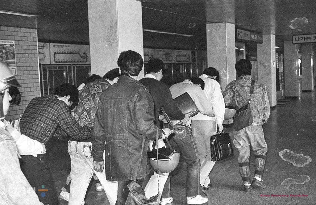- 1989년 4월 8일 오후 3시 민중운동탄압 분쇄 및 노동자 학생연대를 위한 학생투쟁연합주비위 소속 서울시내 17개대학생 4백여명이 한양대 민주광장에 모여 학생투쟁연합 준비위원회 발족식 및 노학선봉대 출정식이 예정되어 있는 가운데 한양대역 전철역입구에서 경찰이 불심검문을 붙잡은 대학생들을 강제연행하고 있다.