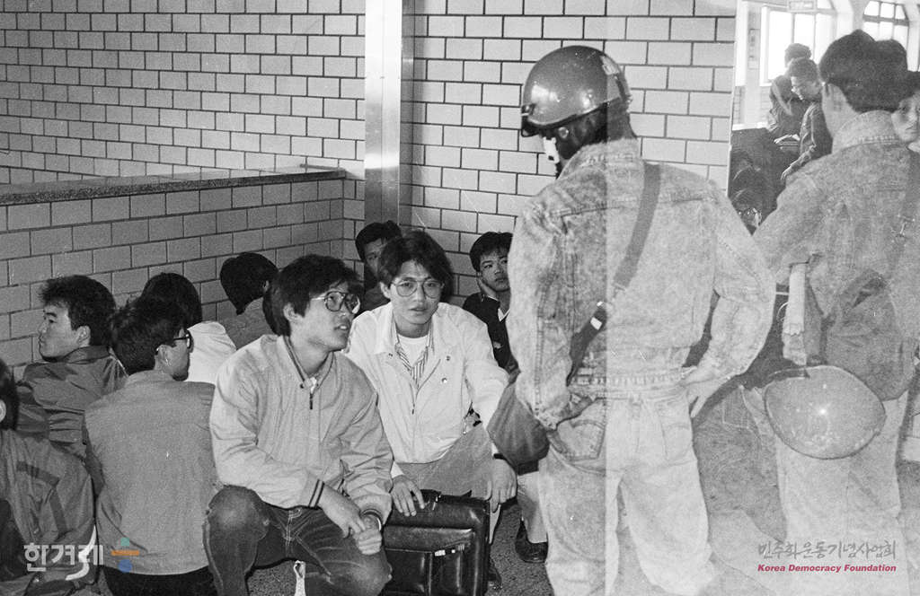 - 1989년 4월 8일 오후 3시 민중운동탄압 분쇄 및 노동자 학생연대를 위한 학생투쟁연합주비위 소속 서울시내 17개대학생 4백여명이 한양대 민주광장에 모여 학생투쟁연합 준비위원회 발족식 및 노학선봉대 출정식이 예정되어 있는 가운데 한양대역 전철역입구에서 경찰이 불심검문을 붙잡은 대학생들을 강제연행하고 있다.