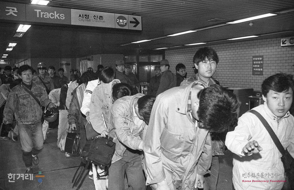 - 1989년 4월 8일 오후 3시 민중운동탄압 분쇄 및 노동자 학생연대를 위한 학생투쟁연합주비위 소속 서울시내 17개대학생 4백여명이 한양대 민주광장에 모여 학생투쟁연합 준비위원회 발족식 및 노학선봉대 출정식이 예정되어 있는 가운데 한양대역 전철역입구에서 경찰이 불심검문을 붙잡은 대학생들을 강제연행하고 있다.