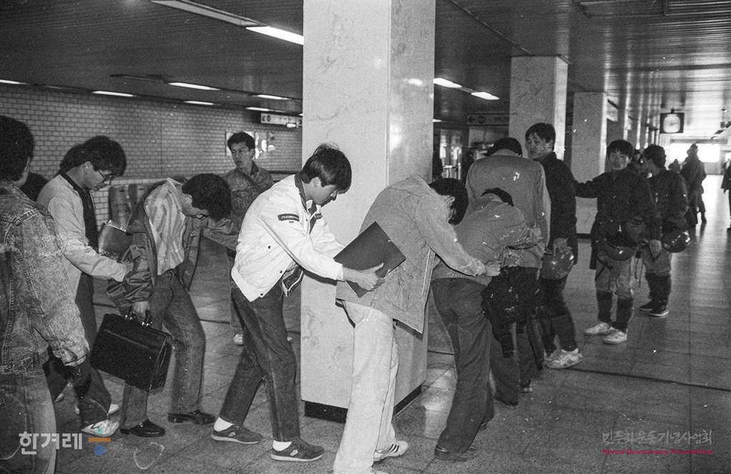 - 1989년 4월 8일 오후 3시 민중운동탄압 분쇄 및 노동자 학생연대를 위한 학생투쟁연합주비위 소속 서울시내 17개대학생 4백여명이 한양대 민주광장에 모여 학생투쟁연합 준비위원회 발족식 및 노학선봉대 출정식이 예정되어 있는 가운데 한양대역 전철역입구에서 경찰이 불심검문을 붙잡은 대학생들을 강제연행하고 있다.