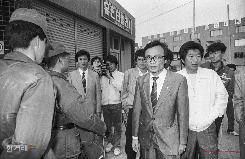 - 1989년 4월 10일 공권력 투입 11일째을 맞고 있는 울산 현지에 이해찬의원을 비롯한 국회노동위 현대중공업 사태 진상조사단이 노동자와 현지 주민, 경찰을 만나 사정을 듣고 있다. 국회 진상조사단은 경찰 지도부, 회사임원진, 현 노조집행부 등을 차례로 만나 사태수습을 위한 중재활동을 펼쳤으나 회사의 기존 노조거부와 경찰의 검거 고집으로 중계노력이 한계에 부닥쳤다.