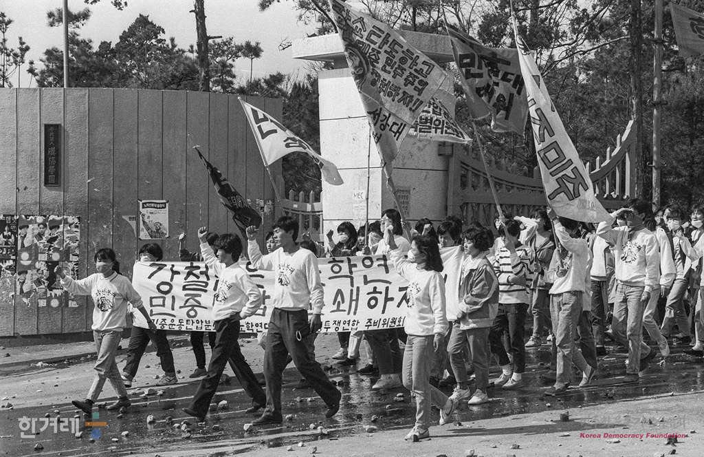 - 1989년 4월 8일 오후 3시 민중운동탄압 분쇄 및 노동자 학생연대를 위한 학생투쟁연합주비위 소속 서울시내 17개대학생 4백여명이 한양대 민주광장에 모여 학생투쟁연합 준비위원회 발족식 및 노학선봉대 출정식을 마친 뒤 교문밖진출을 시도하고 있다.