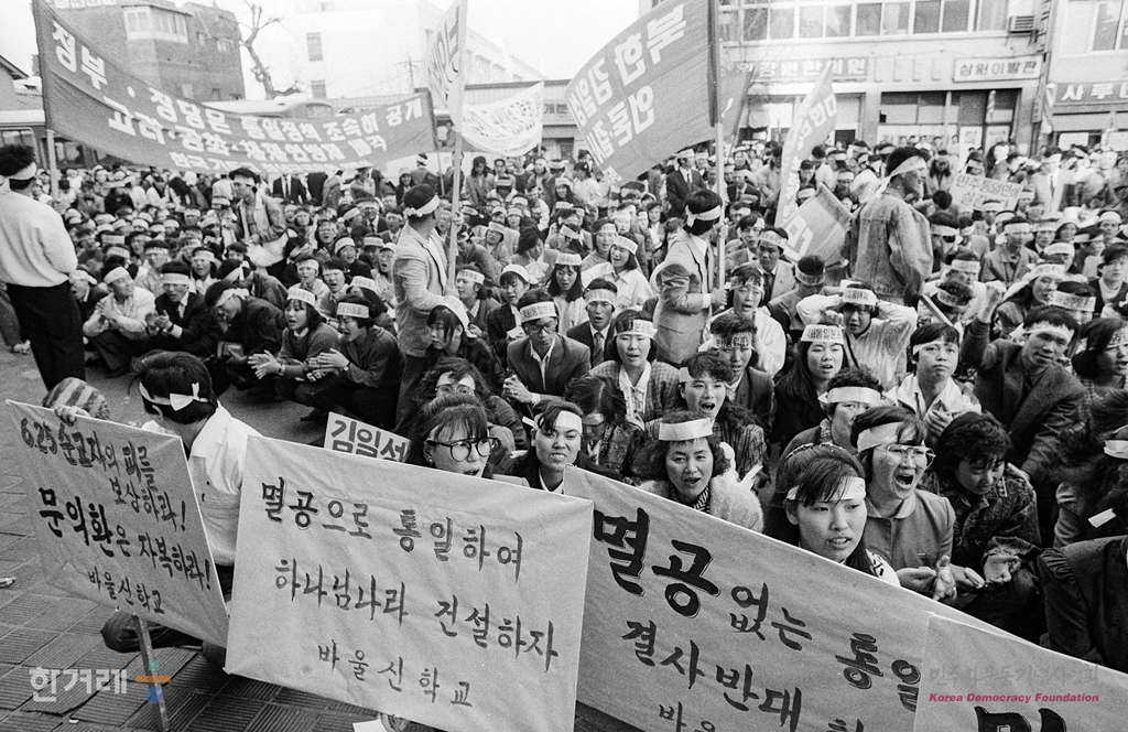 - 1989년 4월 8일 한국기독교 청년구국운동 연합회 소속 교인들이 서울 종로구 기독교회관앞에서 문목사방북 규탄집회를 하고 있다.