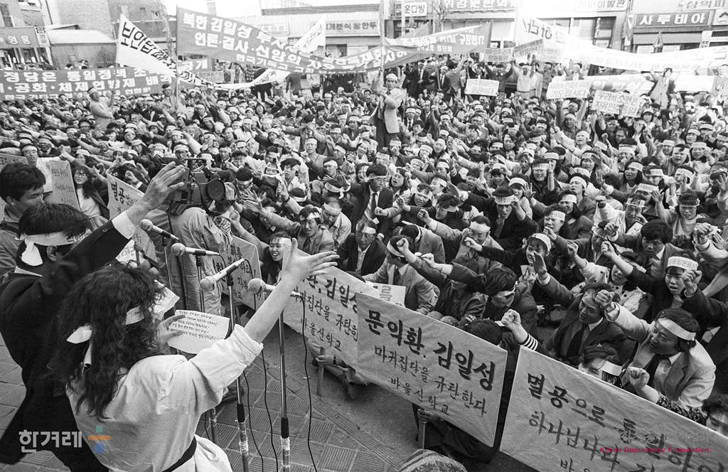 - 1989년 4월 8일 한국기독교 청년구국운동 연합회 소속 교인들이 서울 종로구 기독교회관앞에서 문목사방북 규탄집회를 하고 있다.