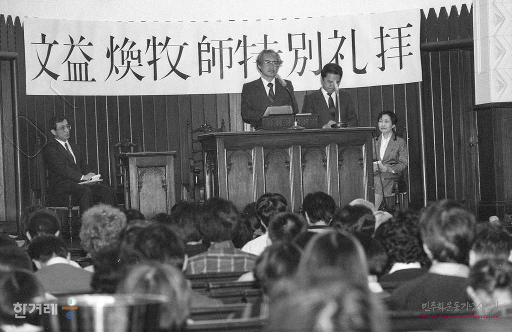 - 1989년 4월 9일 문익환 목사가 도쿄도 가와사키시에 있는 한인교회에서 이인하 목사의 안내로 동포들과 인사를 나누고 특별 설교를 하고 있다.