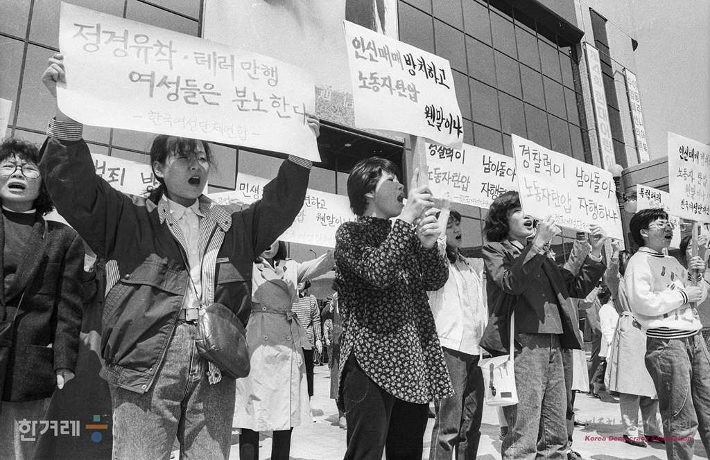 - 1989년 4월 11일 낮 12시30분 한국여성단체연합(회장 이우정), 민가협 소속 회원 등 68여명은 서울 강남구 압구정동 현대백화점 압구정 본점과 현대자동차 압구정 영업소앞에서 현대중공업 노동쟁의에 대한 공권력 개입을 규탄하는 시위를 벌이고 있다.