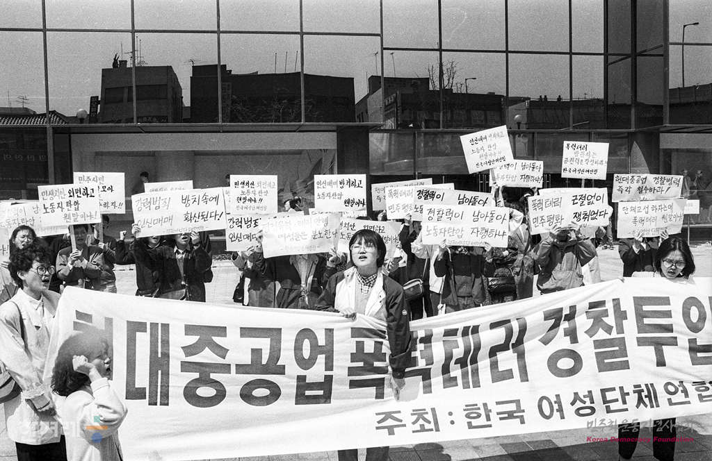 - 1989년 4월 11일 낮 12시30분 한국여성단체연합(회장 이우정), 민가협 소속 회원 등 70여명은 서울 강남구 압구정동 현대백화점 압구정 본점과 현대자동차 압구정 영업소앞에서 현대중공업 노동쟁의에 대한 공권력 개입을 규탄하는 시위를 벌이고 있다.