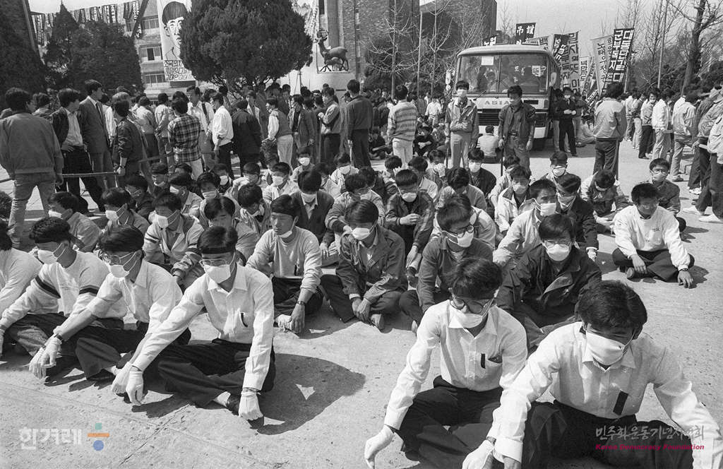 - 1989년 4월 12일 오전 11시 45분 지난 7일 자주 민주 통일 등의 구호를 외치며 교내에서 분신 자살한 서울교대생 남태현씨의 영결식이 서울교대에서 열려 유가족 학생 시민 등 2천여명이 참석한 가운데 민주학생장으로 거행되고 있다. 장례행령이 교뮨을 빠져 나가기 전 유족들이 당초 학생들과의 약속과는 달리 남씨의 시신을 화장하려 한 사실이 밝혀져 밤늦게까지 장례식을 치르지 못했다.