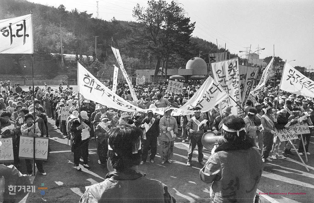 - 1989년 4월 12일 경남 양산군 고리 원자력발전소 주변 주민들 1천여명이 핵 폐기물 불법 매립과 관련해서 고리 원자력발전소 정문앞에서 핵폐기물을 싣고와 셍존권 보장을 요구하며 시위를 벌이고 있다.