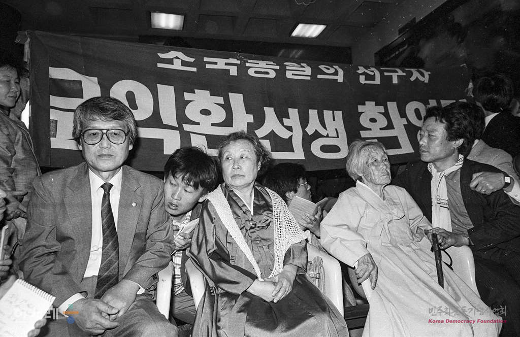 - 1989년 4월 13일 북한을 방문하고 24일만에 돌아오는 문익환목사를 환영하기 위해 김포공항 대합실에 나온 가족과 환영단은 문목사가 수사요원에 의해 계류장에서 바로 연행되었다는 소식을 듣고 허탈해하고 있다.
