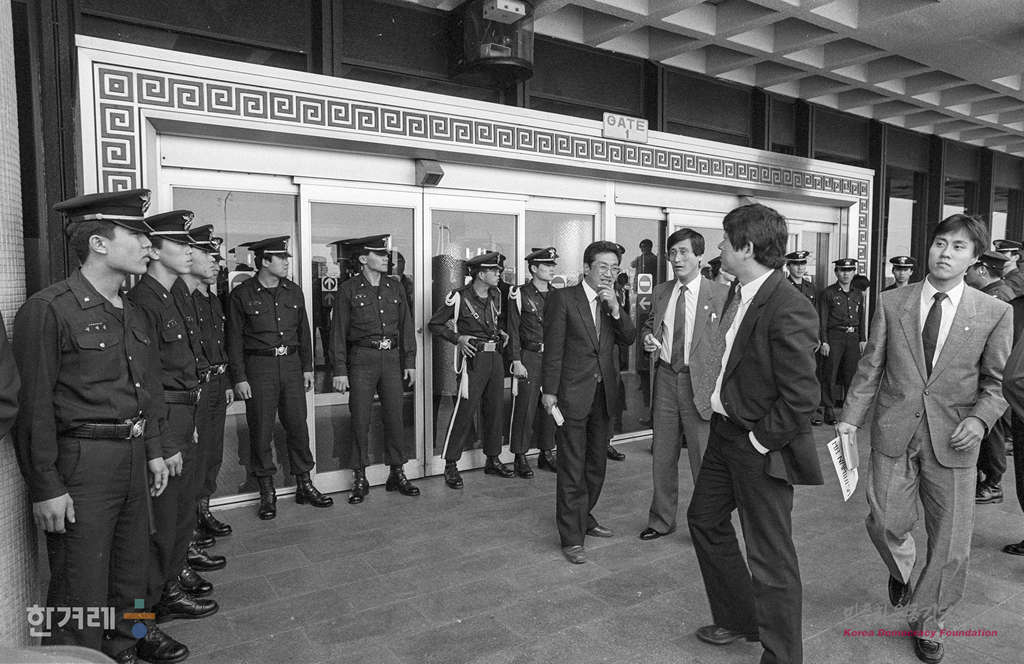 - 1989년 4월 13일 경찰들이 북한을 방문하고 24일만에 돌아오는 문익환목사를 환영하기 위해 환영단을 막기위해 김포공항 입구를 봉쇄한 체 환영단을 연행하고 있다