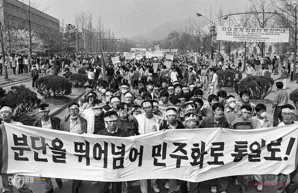 - 1989년 4월 13일 낮 12시 재야단체 회원 및 대학생 1천 5백여명이 참석한 가운데 서울 연세대 민주광장에서 문목사 환영대회를 하고 있다.