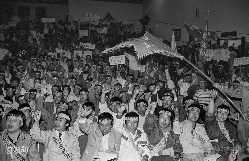 - 1989년 4월 13일 전국택시노동조합소속 노동자들이 서울 여의도 한국노총 강당에서 완전월급제 쟁취대회를 하고 있다.