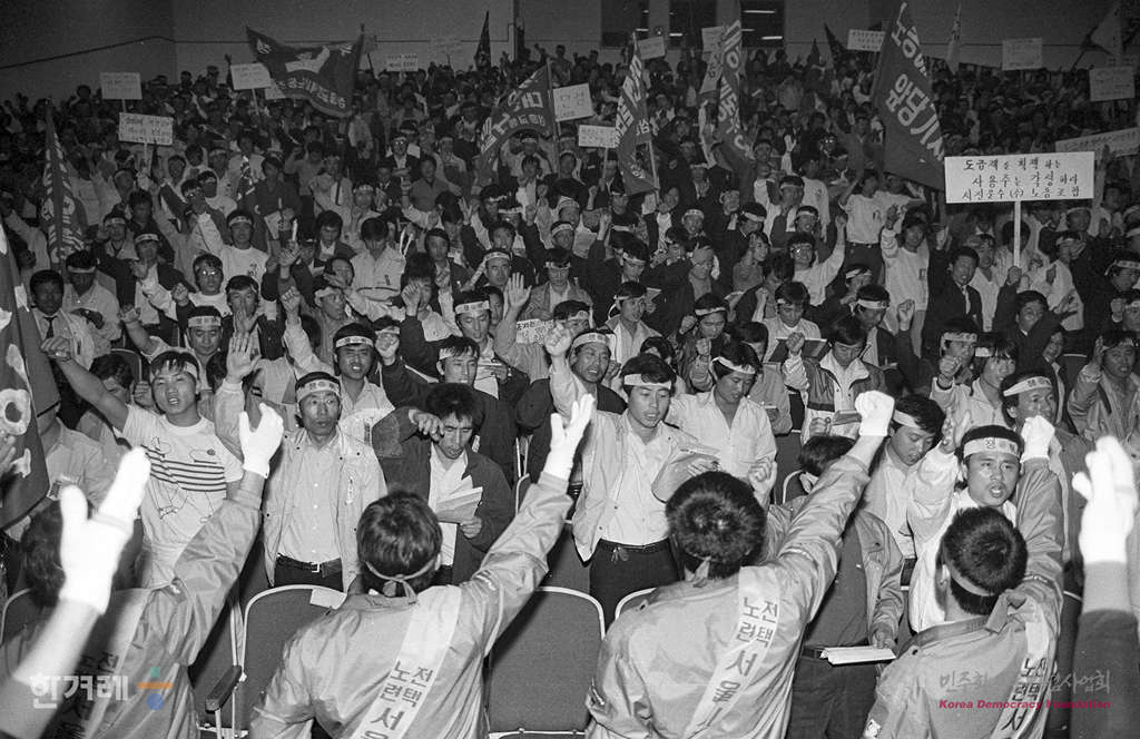 - 1989년 4월 13일 전국택시노동조합소속 노동자들이 서울 여의도 한국노총 강당에서 완전월급제 쟁취대회를 하고 있다.