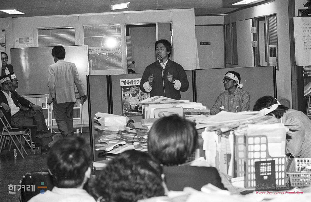 - 1989년 4월 15일 이영희 논설고문의 구속 등 한겨레신문 탄압이 알려진 뒤 이틀째 한겨레사원들이 밤생농성중인 가운데 각계 인사들의 격려방문이 줄을 있고 있다.
