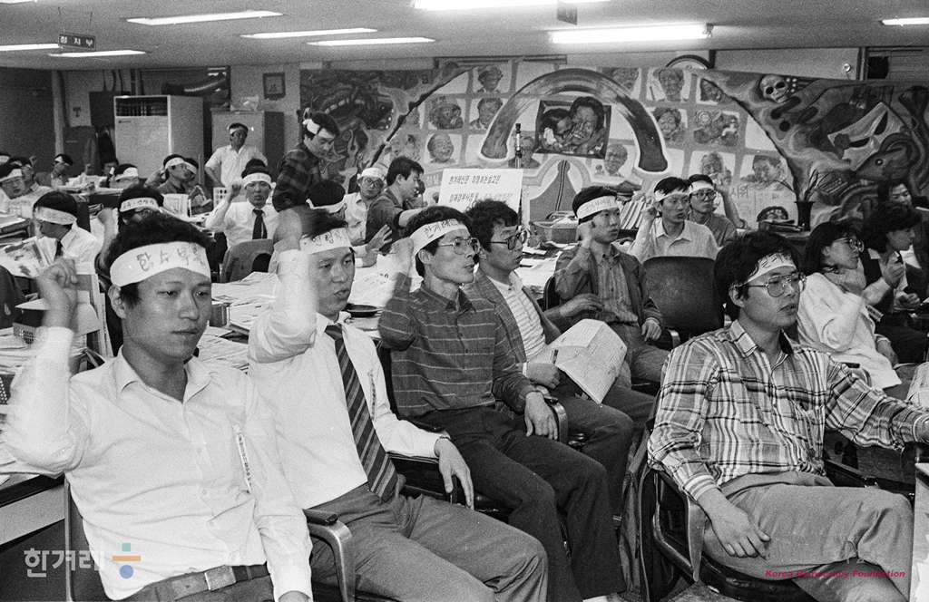 - 1989년 4월 15일 이영희 논설고문의 구속 등 한겨레신문 탄압이 알려진 뒤 이틀째 한겨레사원들이 밤생농성중인 가운데 각계 인사들의 격려방문이 줄을 있고 있다.