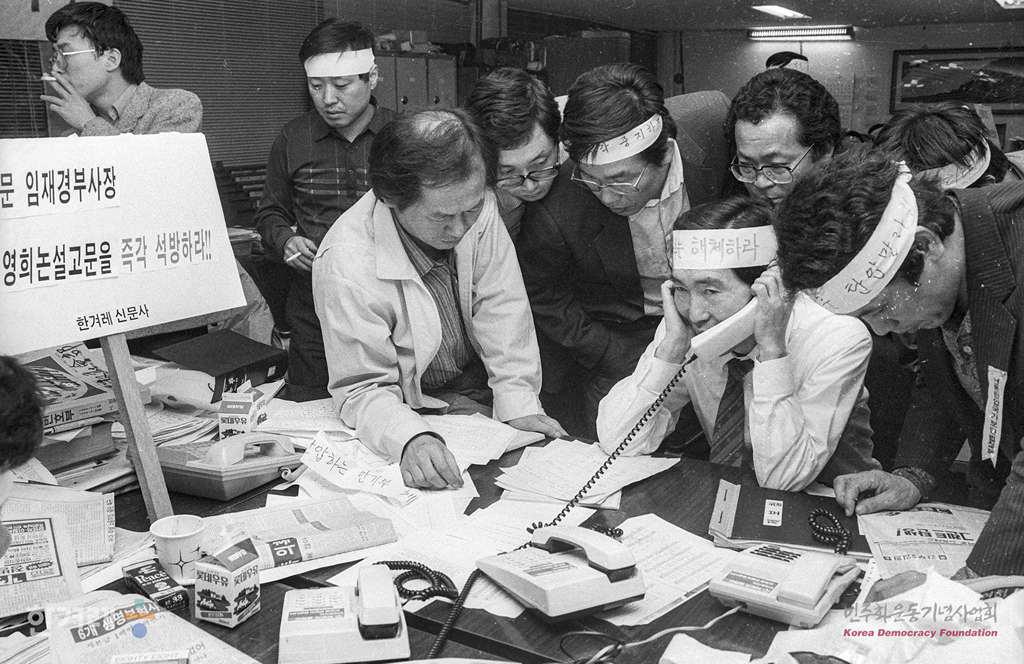 - 1989년 4월 14일 북한방북취재게획을 했다는 이유로 이영희 논설고문의 구속 등 한겨레신문 탄압이 계속되는 가운데 한겨레신문 장윤환 편집위원장이 임의동행을 요구하는 합수부쪽의 전화를 받고 있다.