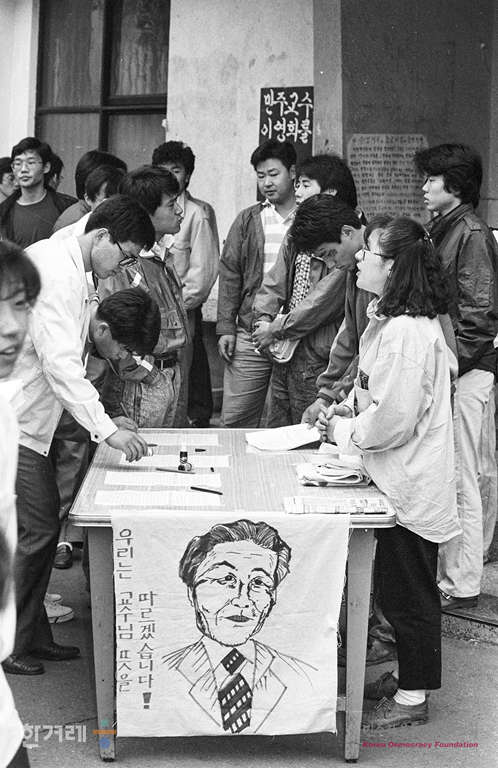 - 1989년 4월 17일 한양대 학생들이 대학구내 사회과학대 등에 서명대를 마련하고 신문방송학과 교수인 이영희 한겨레신문 이사 겸 논설고문의 즉각 석방을 요구하는 서명운동을 벌이고 있다.