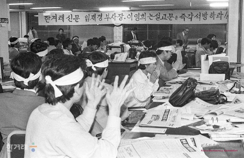 - 1989년 4월 17일 한겨레신문 사원들이 편집국에서 비상총회를 열어 이영희 논설고문의 석방과 임재경 부사장의 불구속 입건조치 철회 및 장윤환 편집위원장의 연행기도 중단될 때가지 밤샘농성을 계속하기로 결의하고 있다.