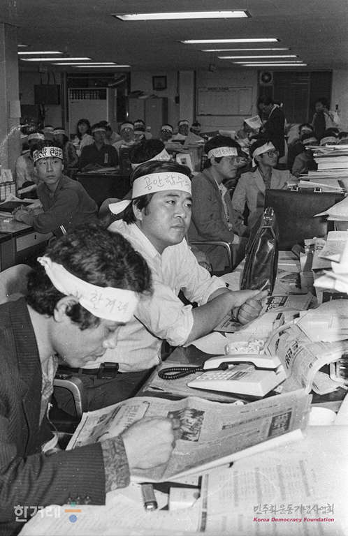 - 1989년 4월 17일 한겨레신문 사원들이 편집국에서 비상총회를 열어 이영희 논설고문의 석방과 임재경 부사장의 불구속 입건조치 철회 및 장윤환 편집위원장의 연행기도 중단될 때가지 밤샘농성을 계속하기로 결의하고 있다.