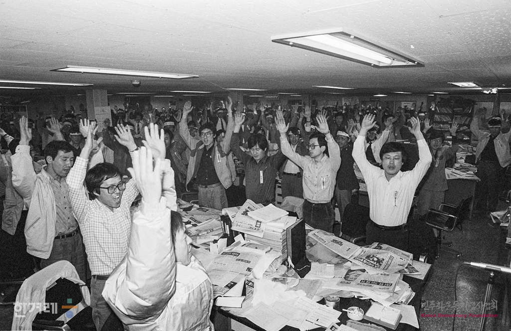 - 1989년 4월 17일 한겨레신문 사원들이 편집국에서 비상총회를 열어 이영희 논설고문의 석방과 임재경 부사장의 불구속 입건조치 철회 및 장윤환 편집위원장의 연행기도 중단될 때가지 밤샘농성을 계속하기로 결의하고 있다.