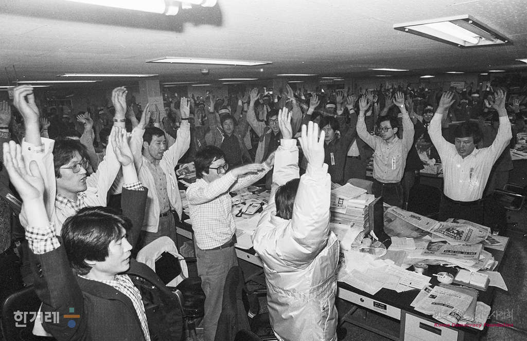 - 1989년 4월 17일 한겨레신문 사원들이 편집국에서 비상총회를 열어 이영희 논설고문의 석방과 임재경 부사장의 불구속 입건조치 철회 및 장윤환 편집위원장의 연행기도 중단될 때가지 밤샘농성을 계속하기로 결의하고 있다.