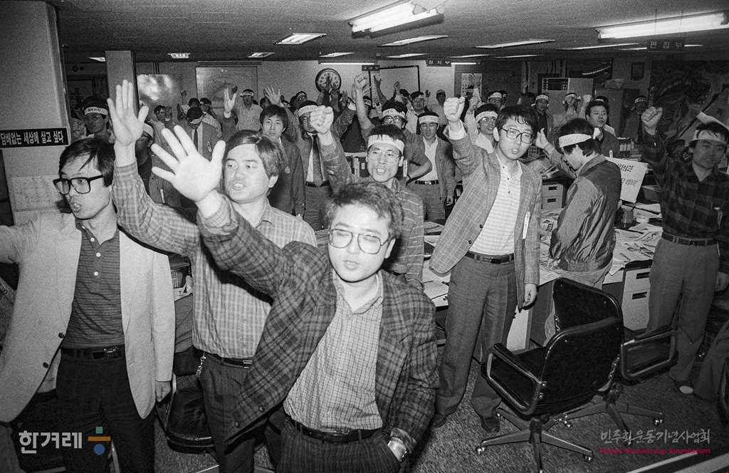 - 1989년 4월 17일 한겨레신문 사원들이 편집국에서 비상총회를 열어 이영희 논설고문의 석방과 임재경 부사장의 불구속 입건조치 철회 및 장윤환 편집위원장의 연행기도 중단될 때가지 밤샘농성을 계속하기로 결의하고 있다.