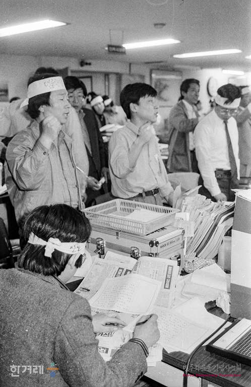 - 1989년 4월 17일 한겨레신문 사원들이 편집국에서 비상총회를 열어 이영희 논설고문의 석방과 임재경 부사장의 불구속 입건조치 철회 및 장윤환 편집위원장의 연행기도 중단될 때가지 밤샘농성을 계속하기로 결의하고 있다.