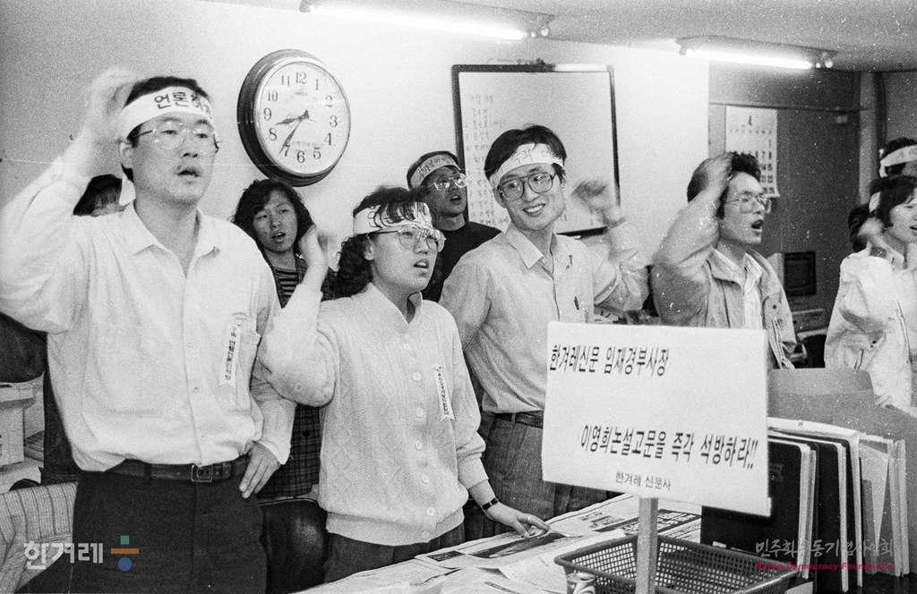 - 1989년 4월 17일 한겨레신문 사원들이 편집국에서 비상총회를 열어 이영희 논설고문의 석방과 임재경 부사장의 불구속 입건조치 철회 및 장윤환 편집위원장의 연행기도 중단될 때가지 밤샘농성을 계속하기로 결의하고 있다.