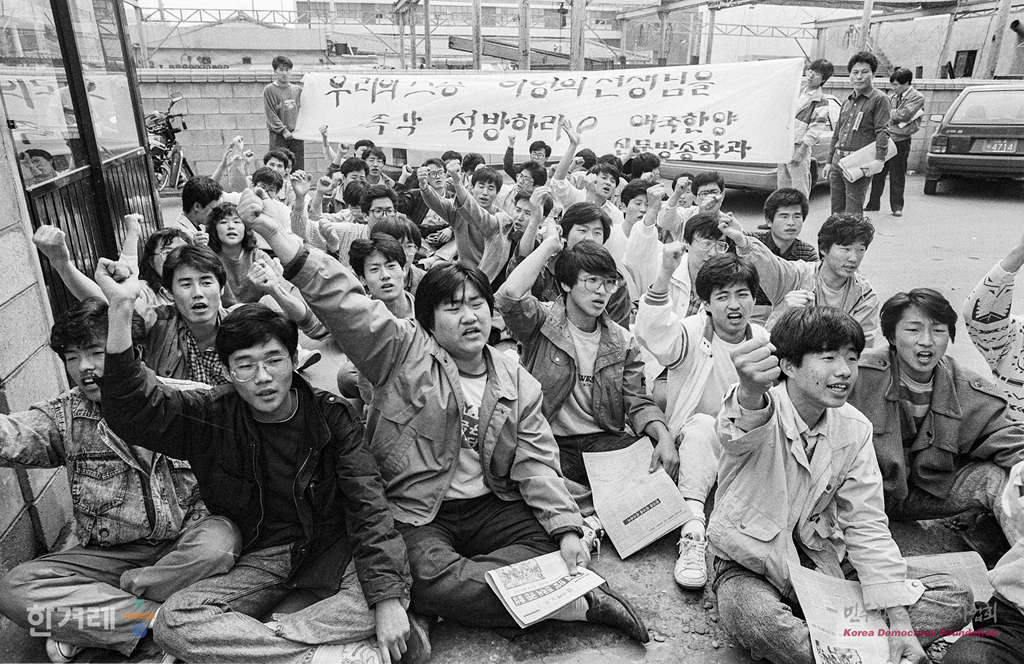 - 1989년 4월 18일 한겨레신문에 대한 당국의 탄압을 규탄하고 민주언론쟁취를 다짐하는 전국 언론인들의 집회가 잇따르는 가운데 이영희논설고문이 재직하고 있는 한양대학교 신문방송학과 학부 대학원생이 교내에서 석방촉구 집회를 마친뒤 한겨레신문 지지방문을 하고 있다.